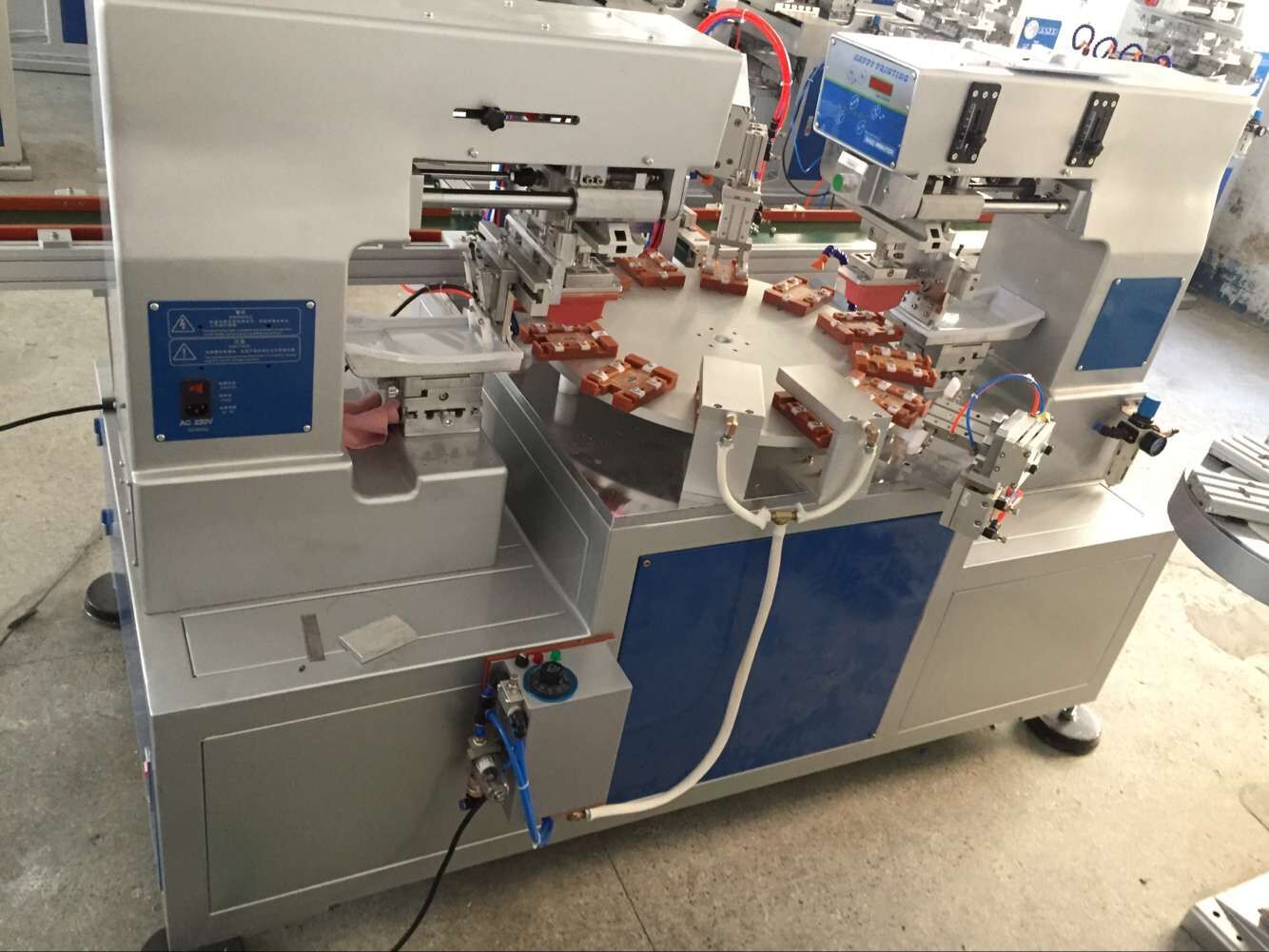 1、 印刷速度比轉盤機慢,但印刷工件可以大一些,四個顏色一次套色印刷完成。