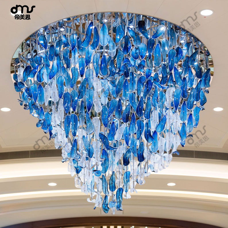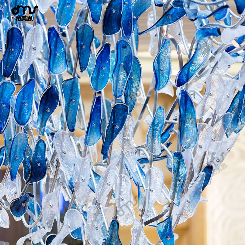 個性簡約藍色手工琉璃玻璃葉片大型吸頂吊燈